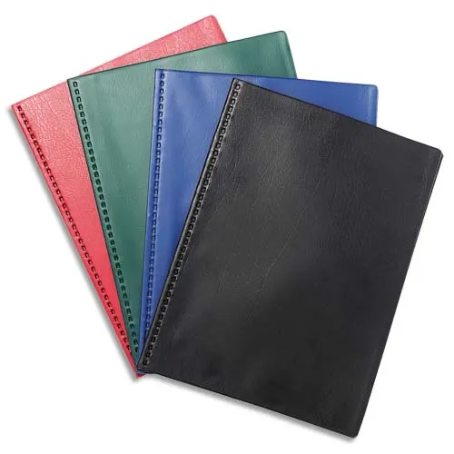 Couverture en PVC opaque 3/10e. Pochettes cristal 5,5/100e anti-transfert d’encre, format A4. Ouverture à plat.
