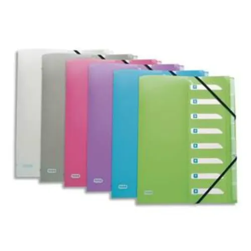 4/10 doorschijnende polypropyleen hoes. Compartimenten in 3/10e polypropyleen, neutrale accenten. Uitneembaar indexblad op de 1e omslag, zak met 3 kleppen op de 4e omslag. Elastische sluiting.